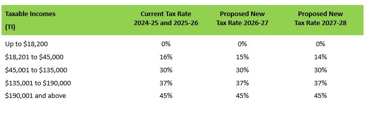 This new round of tax cuts is in addition to the initial stage of tax cuts legislated by the Government last year, which have been in effect since 1 July 2024. The current and new tax rates are as follows: